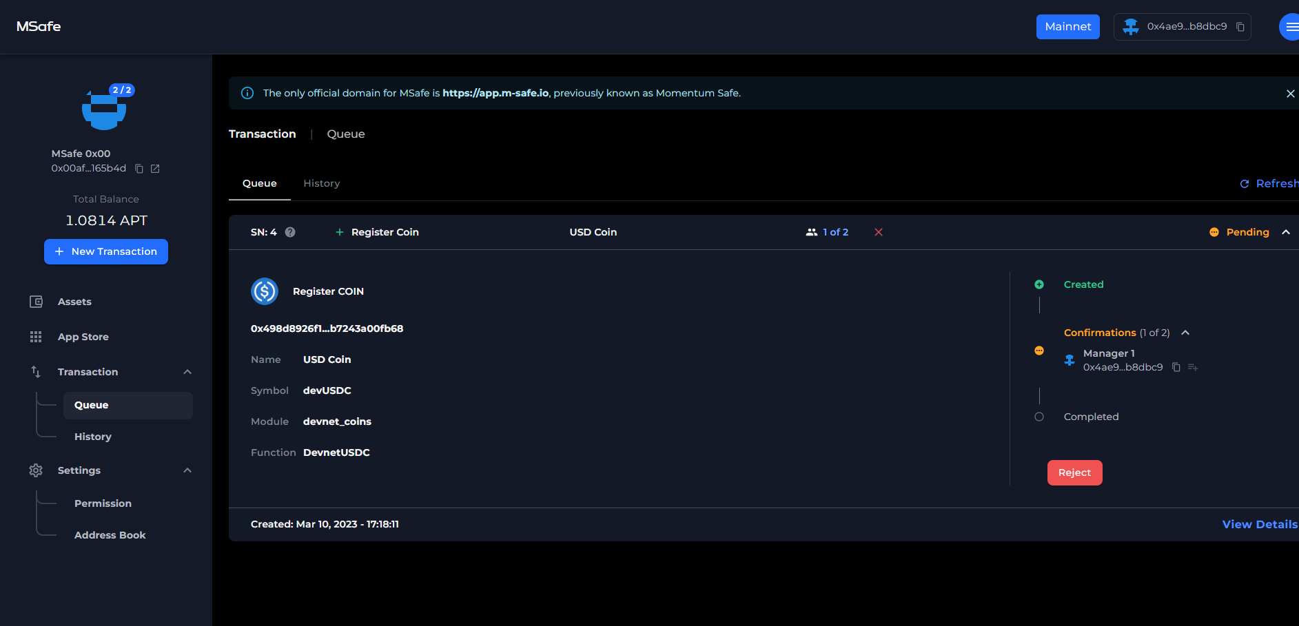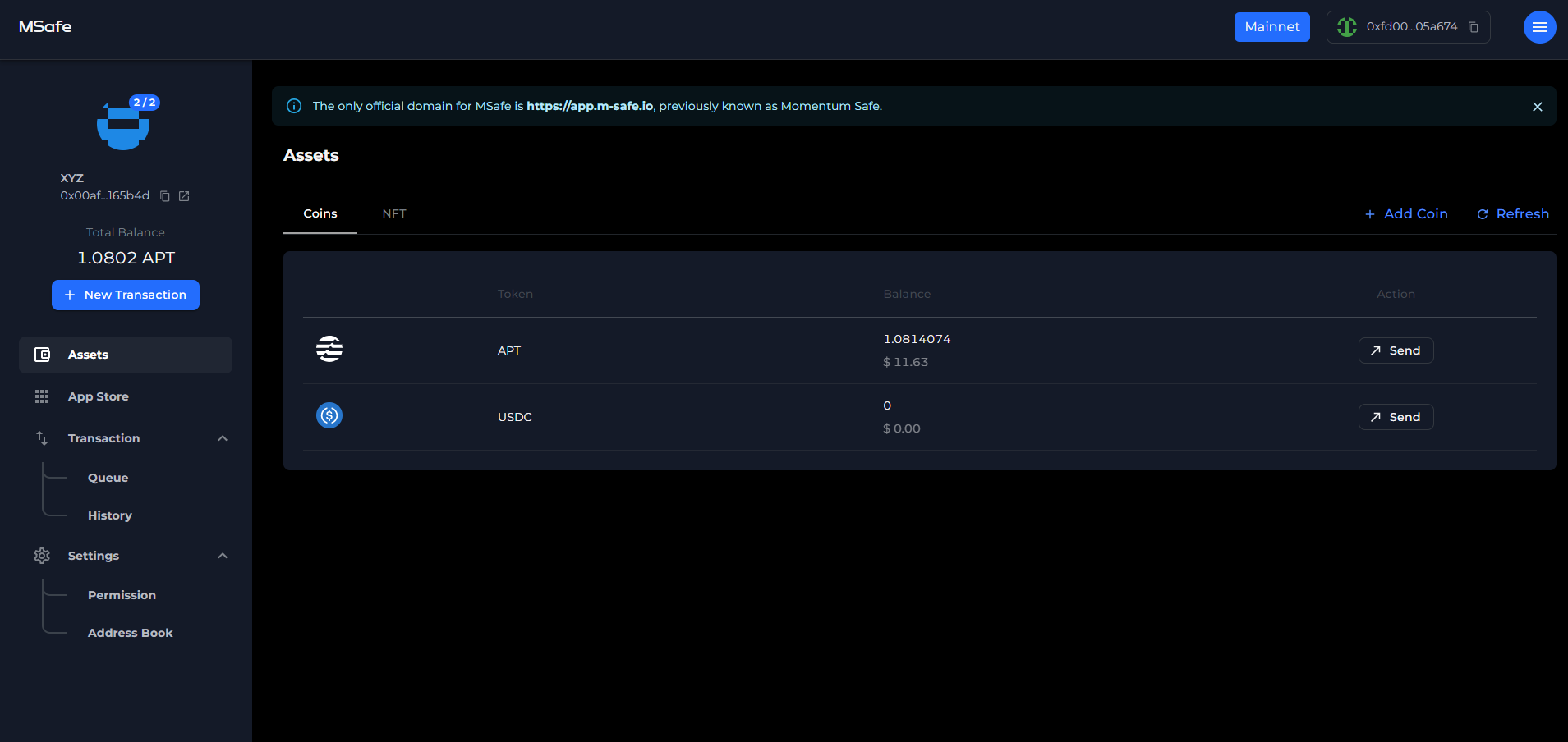 Wait until other users have also confirmed with their signatures. After enough approvals are collected, the transaction will be executed. After execution, you are able to see additional coin type in the 'Asset' page of the MSafe account.&#x20;