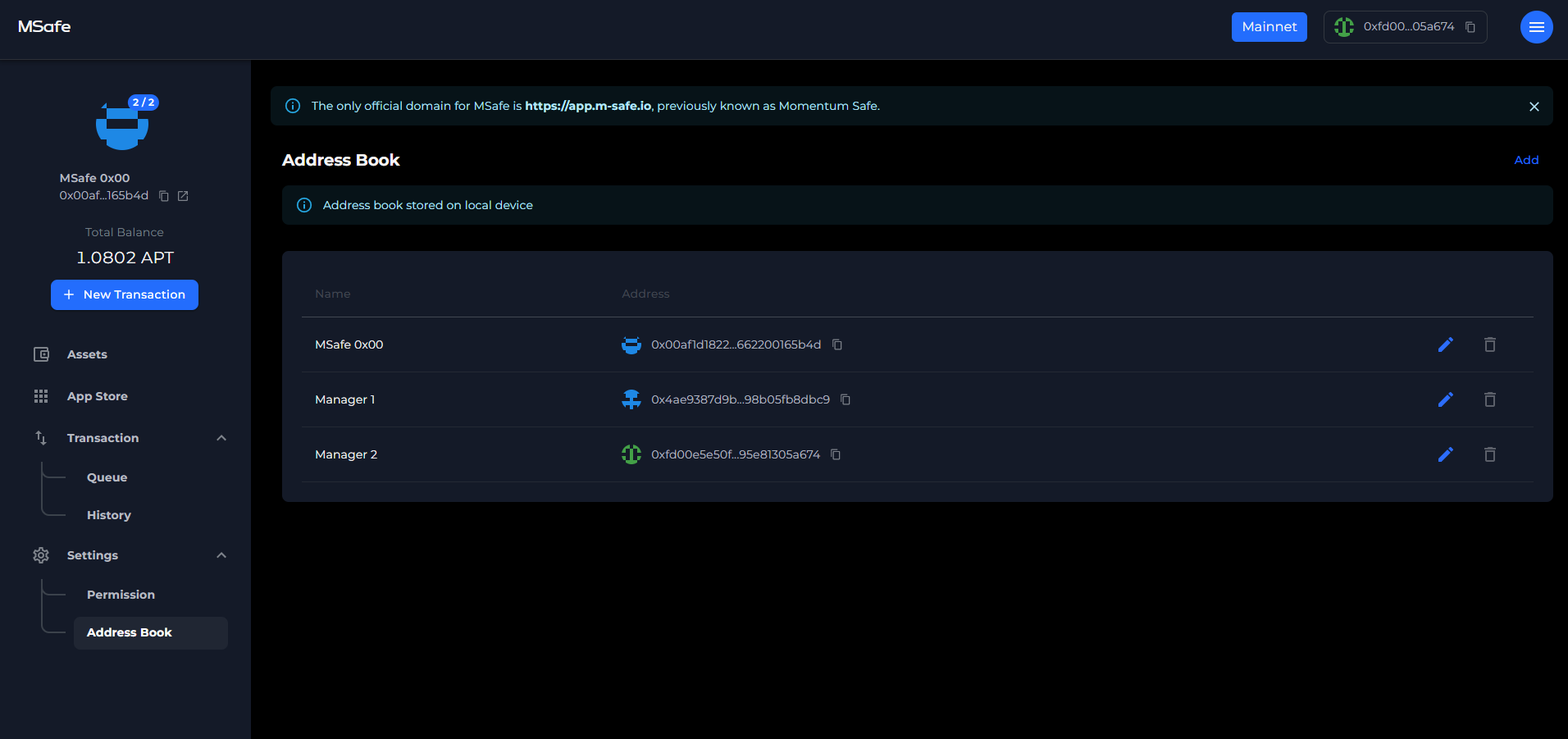 MSafe wallet provides the feature "address book" so that user can save the address name alias in local storage for easy fund management.
