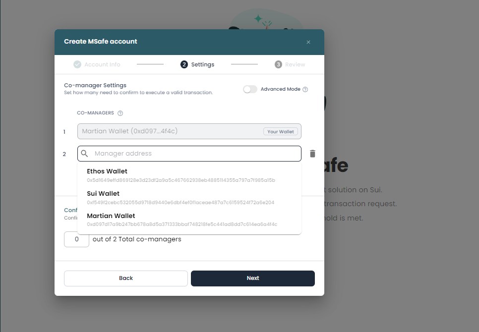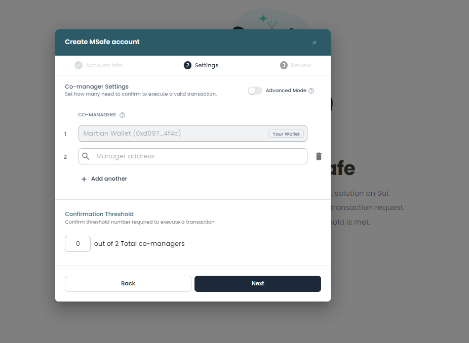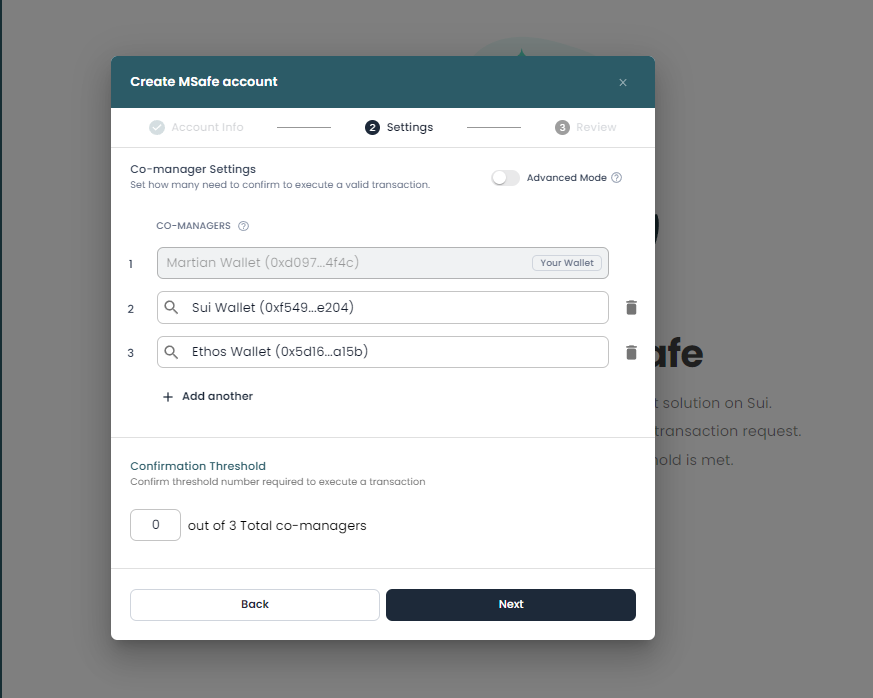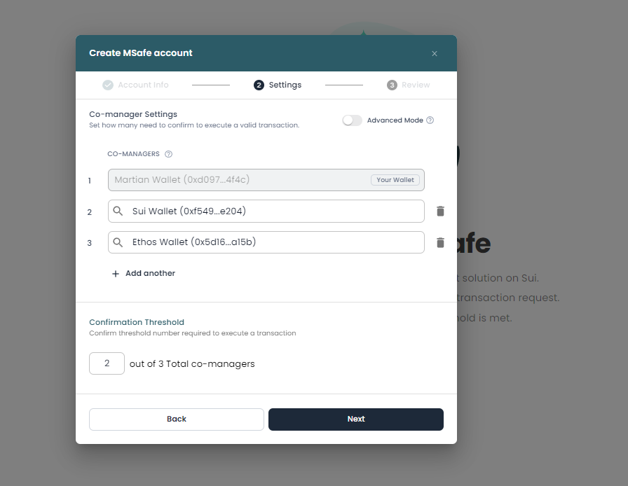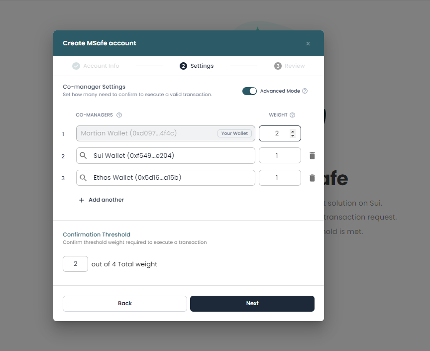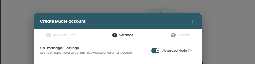 By default, one co-manager's signature is one vote. In the Advanced Mode, you can assign multiple votes to one co-manager. As you assign weighted voting power to a co-manager, the total number of possible votes displayed in the threshold also adjusts accordingly.&#x20;