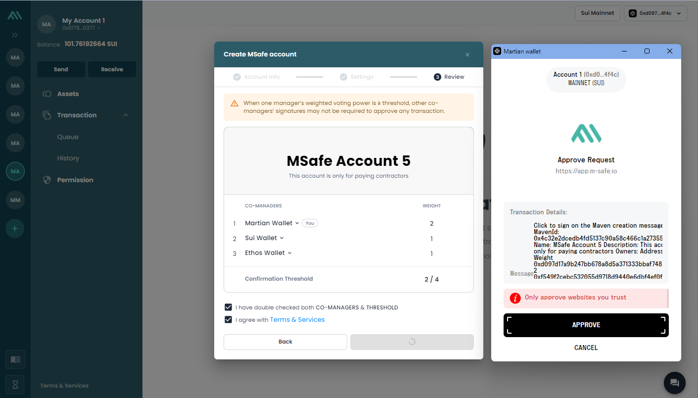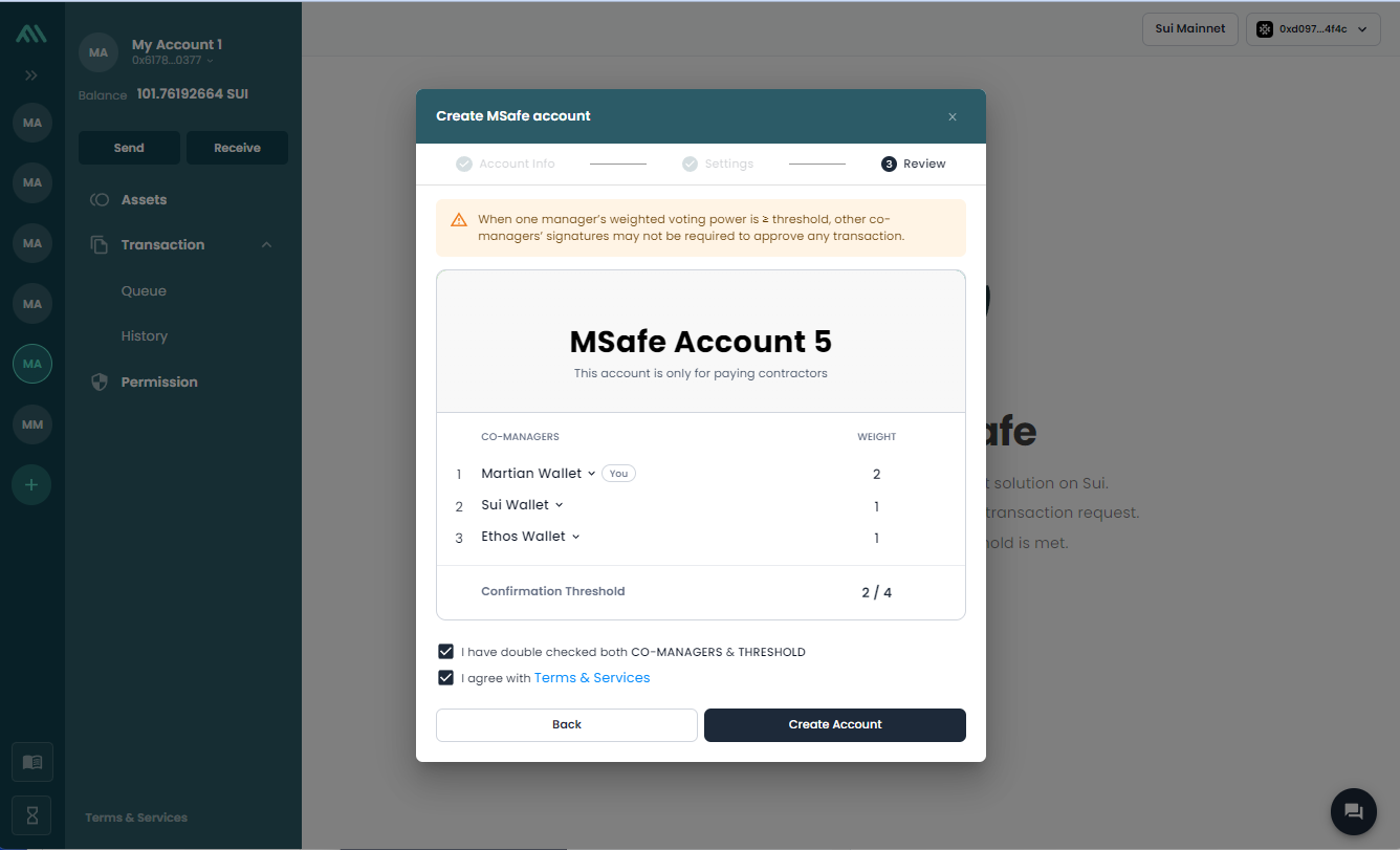 Then click on Next, the pop up will show your desired co-manager selection, weight assignment (if any), threshold, along with a warning message if co-managers have different weights. If one co-manager's weighted voting power is equal to or greater than threshold, this co-manager can approve or reject a transaction without waiting for other co-managers to take actions.