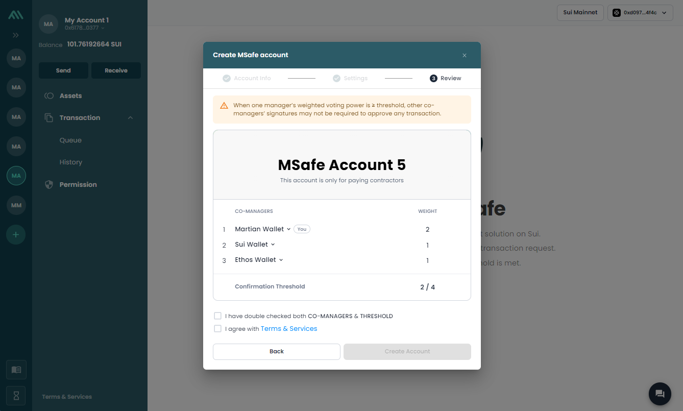 Double check co-managers & threshold, read the Terms & Services, then click on Create Account